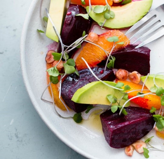 - 4. Add the orange segments and the avocado to the beets and drizzle the dressing over them. Sprinkle the orange zest, then toss to coat, and serve.