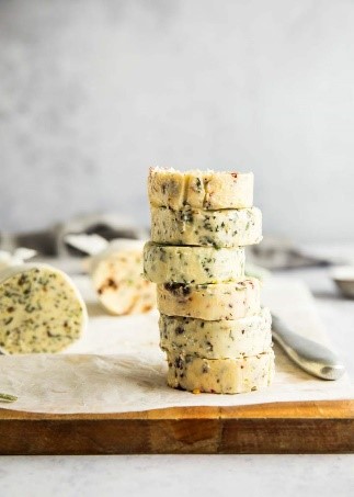 - 3. Gently fold the chopped hazelnuts, garlic, thyme leaves, salt, and pepper into the softened butter or ghee.
