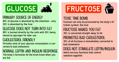 The body’s preferred source of fuel is glucose, the form of sugar we are “wired” to use. While fructose is a simple sugar, the liver must convert it to glucose.  Once converted, it is used for energy if the blood needs glucose, or it will be stored in the liver, or fat cells.  The process of converting fructose results in a waste product called uric acid, a key contributor to gout and heart disease.  A good analogy would be to say that glucose is a clean fuel and fructose is a dirty fuel that pollutes your body.