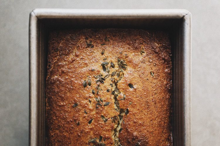 - Pour the batter into the loaf pan and bake on the middle rack of the oven for about 40-50 minutes, until bread is firm to the touch and golden brown on top.