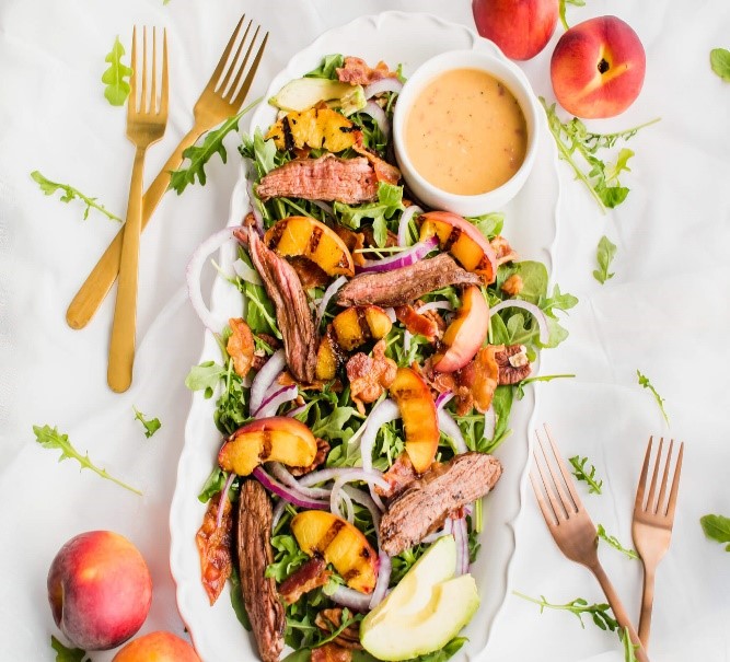 - 8. Arrange lettuces among 4 bowls or plates, top with onion, pecans, avocado, crumbled bacon, then grilled peaches and slices of flank steak. Top with dressing and serve.