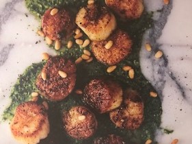 - 3. Spread the pesto on a plate, top with the scallops and sprinkle with the additional 1 tablespoon pine nuts and serve immediately.