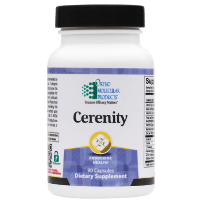 Cerenity* is designed to address daily stress by increasing production of the neurotransmitters serotonin and gamma-aminobutyric acid (GABA) in the brain.  Neurotransmitters are the chemical messengers that regulate mood, memory, sleep cycle and daily stress.  High levels of stress, dietary deficiencies, genetic factors, medications and toxins all play a role in neurotransmitter depletion and imbalance.  The nutrients in Cerenity support healthy neurotransmitter levels for balancing the stress response.  L-theanine, an amino acid found in green tea, has been shown to quickly improve stress perception and resilience.  PharmaGABA, a patented and naturally sourced form of GABA, has been shown to promote relaxation in the central nervous system. 5-hydroxytryptophan (5-HTP) is an amino acid intermediate that is directly converted into the mood-regulating neurotransmitter serotonin.  Taurine is an amino acid that activates GABA receptors. Inositol is crucial for the release of neurotransmitters from within nerve cells.  The essential micronutrients included in Cerenity aid in the synthesis of serotonin and GABA.  The support of these neurotransmitters helps promote a relaxed mental state, positive outlook and restful sleep cycle.