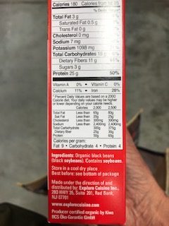 The label read, Ingredients: Organic Black Beans. Manufactured on shared equipment and may contain trace soy. (Right)